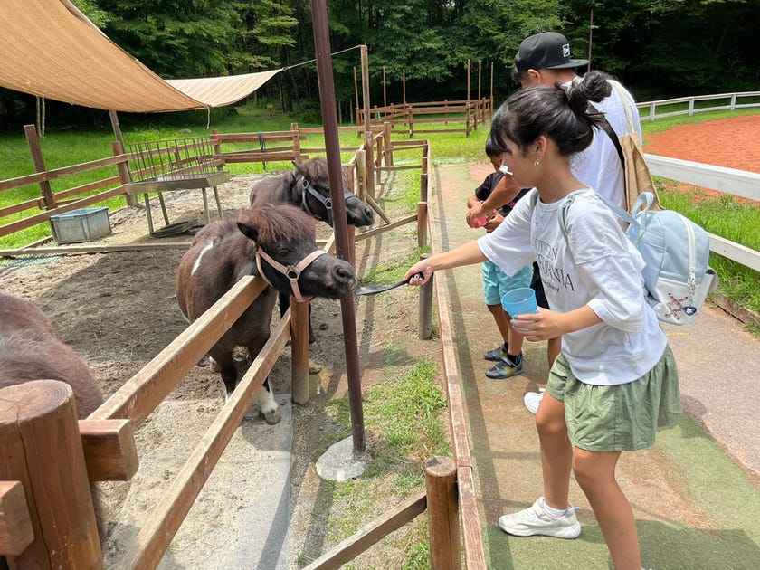 馬にエサをあげたり、馬に乗ったり、